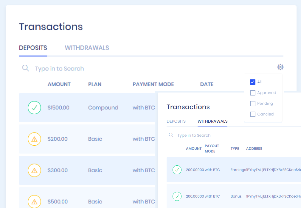 Transactions are divided into deposits and withdrawals. In these tables you can keep track of your approved and pending deposits, and also your paid and unpaid withdrawals for reference.